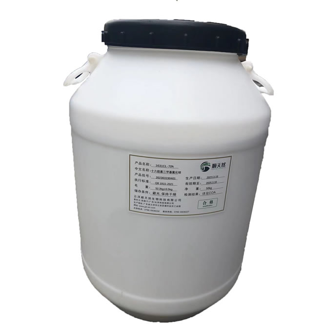 1.16/18 烷基二(èr)甲基叔胺與(yǔ)氯甲烷通過(guo)特殊工藝合(he)成的高品質(zhì)陽離子表面(mian)活性劑。